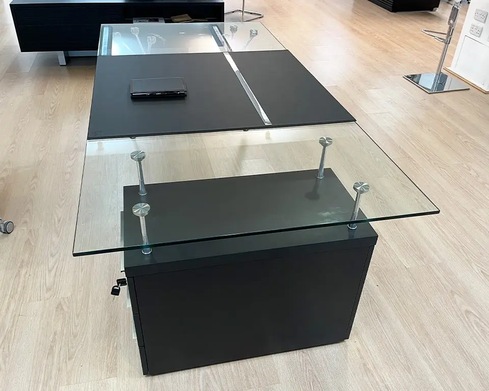 For a large L- Shaped Glass top desk you may also like to consider our CLOUD DESKS range with a lower credenza style side return. You can mix and match Genesis and Cloud products as they are from the same factory.
